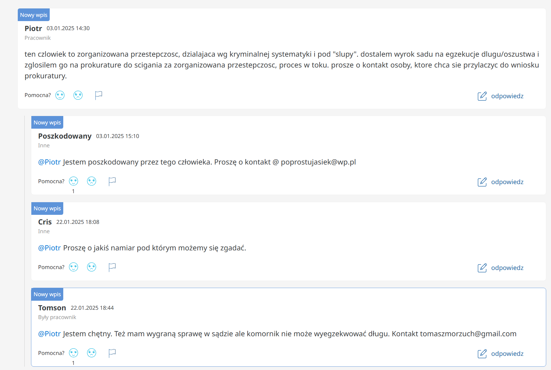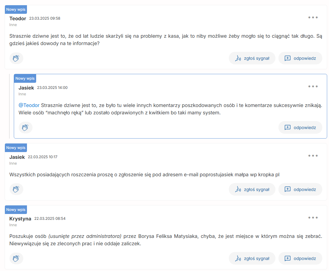 🔗 Zobacz grupę i dołącz do sprawy📬 Jeśli posiadasz informacje, dokumenty, zrzuty ekranów lub inne dane, które powinny znaleźć się na tej stronie – możesz je przesłać na adres kontakt@borysmatysiak.pl lub skontaktuj się z innymi poszkodowanymi.